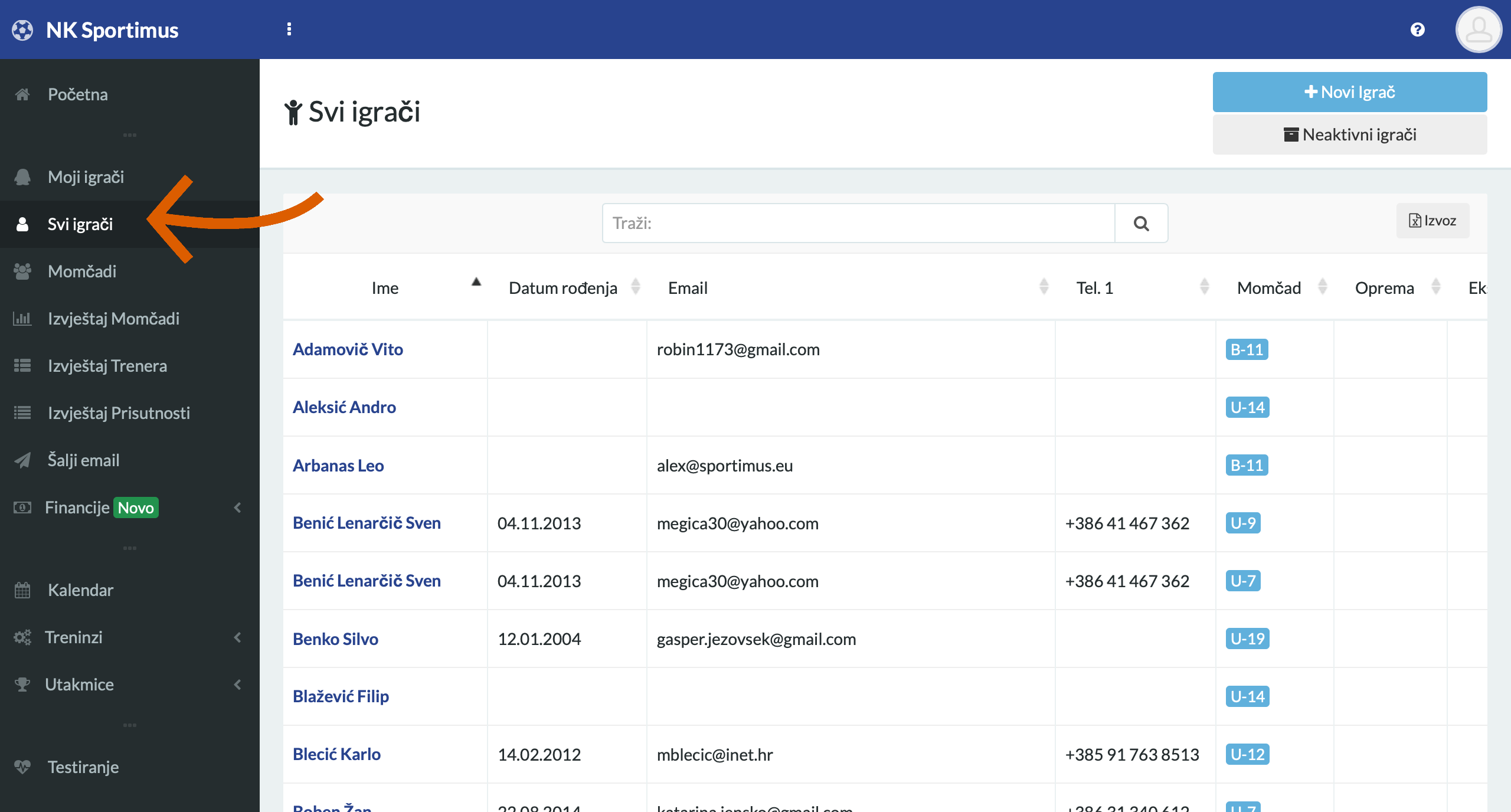 Omogućava uvid u popis svih sportaša u klubu. Za brzo pretraživanje možete koristiti pretraživač iznad popisa sportaša. Jednostavno unesite ime ili prezime sportaša u pretraživač i mehanizam će automatski prikazati rezultate pretraživanja. U gornjem desnom kutu možete unijeti novog sportaša ili pristupiti popisu neaktivnih igrača.