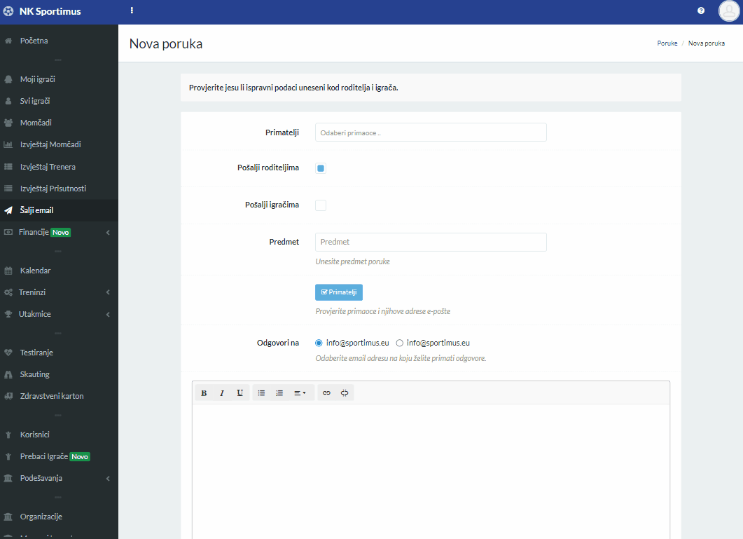 Kod većeg broja sportaša slanje obavijesti može biti dugotrajno. Sportimus vam omogućava slanje e-pošte i SMS poruka u samo nekoliko klikova.