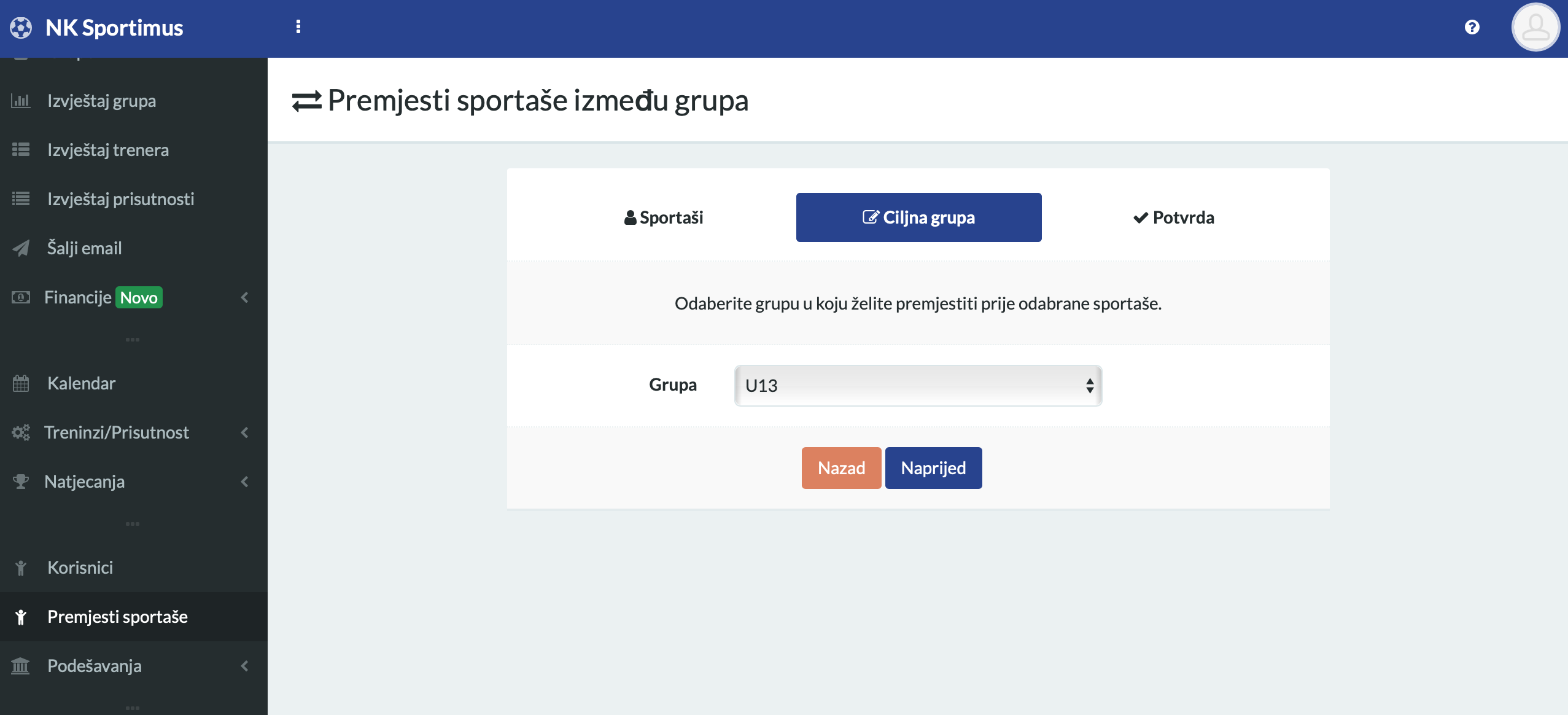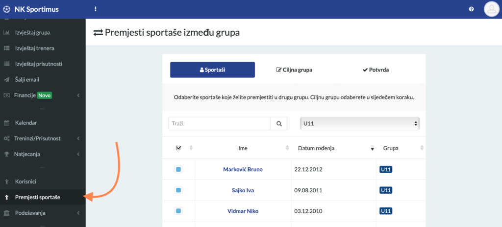- Kliknite „Premjeti sportaše“ na izborniku