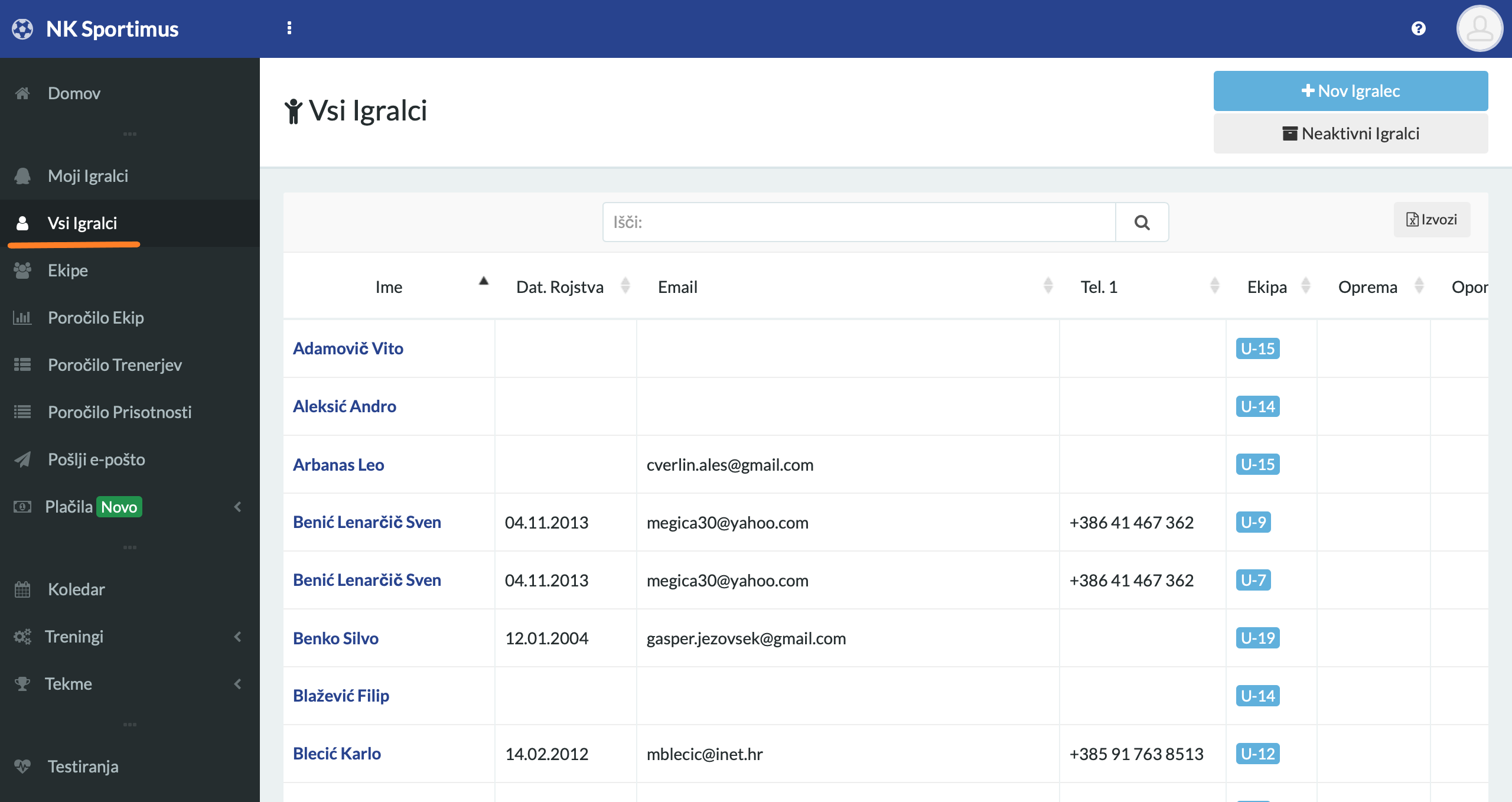 Omogoča vpogled na seznam vseh igralcev v klubu, za hitro iskanje si lahko pomagate z iskalnikom nad seznamom. »Trener – omejen dostop« do vseh igralcev dostopa nima.